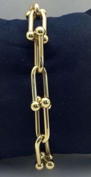 This stunning 14K yellow gold interlinked loop chain is 24 inches long and 5MM wide, weighing 29.5 grams. The chain features a lobster safety clasp. Stamped 14K.