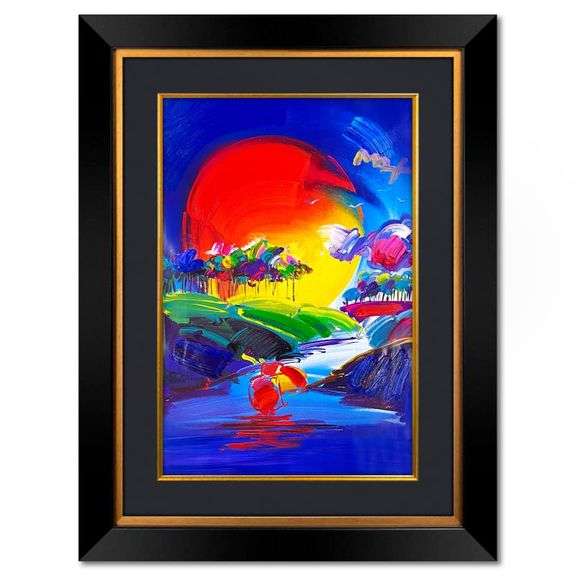 "Without Borders" is a one-of-a-kind mixed media on paper, hand signed by Peter Max. The piece comes custom framed with a backside cutout to display Peter Max Studio registration number 279969 certifying authenticity. Measures approximately 48" x 36" (frame), 36" x 24" (image). This item requires special handling and may have a longer than usual turnaround.