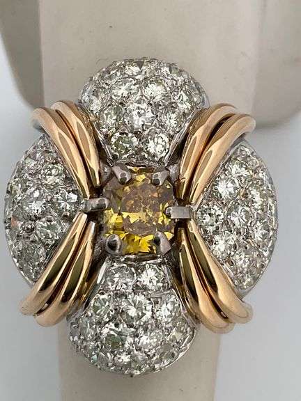 CERTIFIED 18K WHITE AND ROSE GOLD DIAMOND RING. IT HAS ALL NATURAL (NOT LAB GROWN) DIAMONDS WITH A TOTAL WEIGHT OF 2.52 CARATS. CENTER DIAMOND IS A 1.00 CARAT CUSHION CUT SET IN 6 PRONGS, IT IS FANCY YELLOW ORANGE COLOR AND VS2 IN CLARITY .SIDE DIAMONDS ARE ALL ROUND BRILLIANT CUT TOTALING 1.52 CARAT, THEY ARE E-F COLOR AND VS1-SI1 IN CLARITY. RING IS SIZE 4.5-CAN EASILY GET RESIZED BY YOUR LOCAL JEWELER. GOLD WEIGHT IS 11.7 GRAMS. RING IS ALMOST AN INCH LONG. HAS AN AMAZING PRESENCE. DIAMONDS ARE 100% NATURAL. CERTIFIED BY C.G.L, CERTIFICATE #2025170200161589. CAN BE VERIFIED AT CGL-LABS.COM