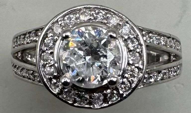 This remarkable, hand-crafted 14K white gold ring is a showcase of genuine luxury and artistry, featuring a substantial 1.46 total carat weight. Its centerpiece is a magnificent earth-mined round brilliant cut diamond of 1.06 Ct which is in a 4-prong setting, with F-G color and I2 clarity. The side stones are round brilliant cut diamonds totaling 0.40 Ct with G color and I2 clarity in a pave setting. The ring weighs 7 grams. Stamped 14K.
