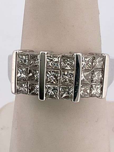 THIS MESMERIZING 14K WHITE GOLD ENGAGEMENT RING FEATURES 14 PRINCESS CUT DIAMONDS , 4 IN THE CENTER AND 5 ON EACH SIDE. THE DIAMONDS HAVE A CLARITY OF VS2-SI1 AND A COLOR GRADE OF G-H. THE RING WEIGHS 5.4 GRAMS AND IS AVAILABLE IN SIZE 6.5 (RESIZABLE). PLACE YOUR BIDS TO BUY NOW