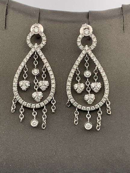 CERTIFIED BRAND NEW 14K WHITE GOLD DIAMOND CHANDALIER EARRINGS. IT HAS ALL NATURAL (NOT LAB GROWN) ROUND BRILLIANT CUT DIAMONDS WITH A TOTAL WEIGHT OF 3.00 CARATS. DIAMONDS ARE E-F COLOR AND VS CLARITY. EARRINGS ARE 1.25 INCHES FROM TOP TO BOTTOM AND 5/8 OF AN INCH WIDE. GOLD WEIGHT IS 8.4 GRAMS. STAMPED 14K. CERTIFIED BY C.G.L, CERTIFICATE ֳ2074844565172164. CAN BE VERIFIED AT CGL-LABS.COM