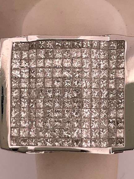 MEN'S CERTIFIED 14K WHITE GOLD DIAMOND RING. IT HAS ALL NATURAL (NOT LAB GROWN) PRINCESS CUT AND ROUND BRILLIANT CUT DIAMONDS WITH A TOTAL WEIGHT OF 6.50 CARATS. PRINCESS DIAMONDS TOTAL 5.25 CARATS, E-F COLOR AND VS CLARITY. ROUND DIAMONDS TOTAL 1.25 CARAT, F-G COLOR AND SI CLARITY. RING IS VERY LARGE AND IMPRESSIVE. IT IS 3/4 OF AN INCH WIDE. SIZE IS 10-CAN EASILY GET REIZED BY YOUR LOCAL JEWELER. GOLD WEIGHT IS AN AMAZING 16.0 GRAMS. STAMPED 14K. DIAMONDS ARE 100% NATURAL. IN MINT CONDITION. CERTIFIED BY C.G.L, CERTIFICATE #2029474898172161. CAN BE VERIFIED AT CGL-LABS.COM