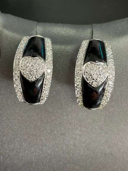 CERTIFIED 18K WHITE GOLD DIAMOND STUD EARRINGS. IT HAS ALL NATURAL (NOT LAB GROWN) ROUND BRILLIANT CUT DIAMONDS WITH A TOTAL WEIGHT OF 1.50 CARATS. DIAMONDS ARE E-F COLOR AND VS1-SI1 CLARITY.EARRINGS HAVE BLACK ENAMEL ON THEM. THEY ARE 7/8 OF AN INCH FROM TOP TO BOTTOM AND 12 MM WIDE. HAS OMEGA CLASPS. CRAFTED IN SOLID 18K WHITE GOLD WITHA TOTAL WEIGHT OF 11.7 GRAMS. STAMPED 750 (18K).IN MINT CONDITION FROM JEWELRY STORE DISPLAY-NEVER WORN.. CERTIFIED BY C.G.L, CERTIFICATE #2077933545157693 CAN BE VERIFIED AT CGL-LABS.COM