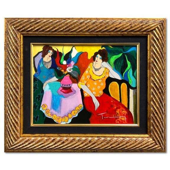 "Tranquility" is a one-of-a-kind mixed media over paint on wood by Itzchak Tarkay (1935-2012), hand signed by the artist. This piece comes custom framed. Includes Letter of Authenticity. Measures approx. 14.5" x 17" (frame), 8.5" x 11" (image).
