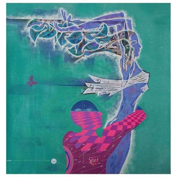 "Apollo & Daphne I (1995)" is an original mixed media painting on paper by Lu Hong. Hand signed by the artist, the piece comes with a letter of authenticity. Measures approximately 35" x 34.5".