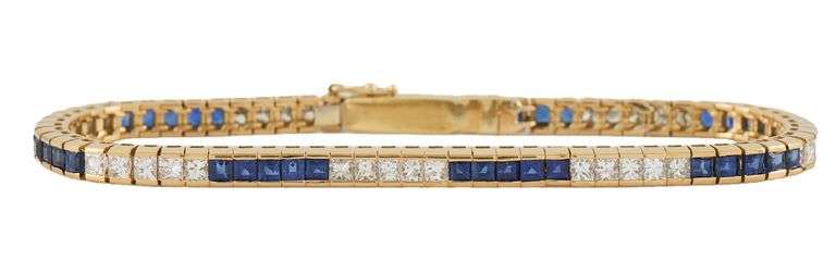 2.80ctw Princess Diamond and 3.00ctw Sapphire Tennis Bracelet in 18K Yellow gold. Clarity: SI2 – I1. Color: H – I. Sapphire Carat Weight: Approx. 3.00ctw. Bracelet Width: Approx. 4.0 MM. Bracelet Length: Approx. 7.25 Inches. Weight: Approx. 19.60 Grams. Stamped: 18K.