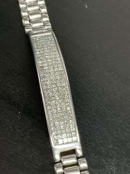 CERTIFIED 14K WHITE DIAMOND BRACELET. IT HAS ALL NATURAL (NOT LAB GROWN) PRINCESS CUT DIAMONDS SET IN AN INVIBLE SETTING WITH A TOTAL WEIGHT OF3.75 CARATS. DIAMONDS ARE G-H COLOR AND SI CLARITY. BRACELET IS 7 INCHES AND 10MM WIDE. HAS A FOLDING LOCK WITH 2 SECURITY LOCKS. GOLD WEIGHT IS 33.0 GRAMS. STAMPED 14K.CERTIFIED BY C.G.L, CERTIFICATE #2061638272178178. CAN BE VERIFIED AT CGL-LABS.COM