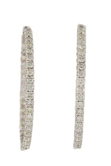 New 2.87ctw Round Diamond Inside Out Hoop Earrings in 14K White gold. Clarity: SI1 – SI2. Color: H – I. Earring Diameter: Approx. 36.0 MM. Weight: Approx. 7.90 Grams. Stamped: 14K.