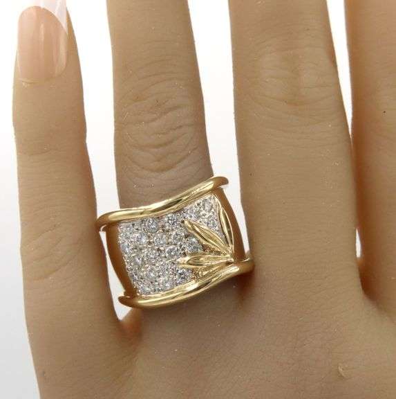 18kt Yellow gold approximate 1.27ctw diamond wide wave ring with leaf motif. Color I-J. Clarity VS2-SI1. The total weight of the ring is 20.60 grams. Ring size 8".