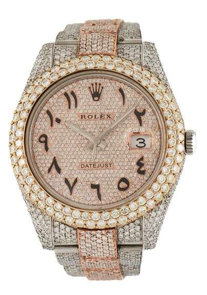 Rolex Datejust II 116300, 41MM, Custom Iced Out, Tri-Tone Men’s Watch. Case Material: 18K Yellow Gold and Stainless Steel. Crystal: Sapphire. Movement: Self Winding Automatic. Band: Aftermarket Iced Out 18K Rose Gold and Stainless Steel Oyster Band. Wrist Size (Approximate): 6.75 inches. Clasp: Stainless Steel Single Fold Oyster clasp Buckle. Case Size: 41.00 mm. Bezel: Aftermarket Iced Out 18K Yellow Gold Bezel. Dial: Aftermarket Iced Out 18K Rose Gold Dial W/Arabic Numeral Markers. Total Weight: 143.60 grams. Swiss Made.