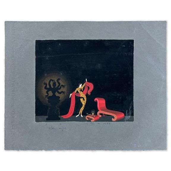 "Mains Noires, Decor, 16 Janvier 1958" is an original gouache painting on paper by Erte (1892-1990), hand signed by the artist. Includes Letter of Authenticity. Measures approx. 10" x 13" (border), 6.5" x 8" (image).There is a crease on the top-right border that ay be cropped when the piece is framed.