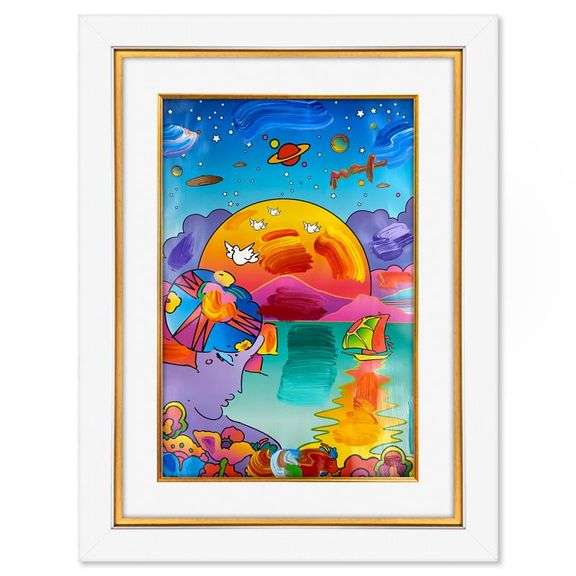 "New Horizon" is a one-of-a-kind mixed media on paper, hand signed by Peter Max. The piece comes custom framed with a backside cutout to display Peter Max Studio registration number 250350 certifying authenticity. Measures approximately 48" x 36" (frame), 36" x 24" (image). This item requires special handling and may have a longer than usual turnaround.