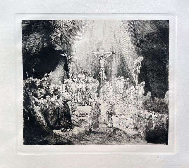 This is a beautiful etching, after Rembrandt, by master engraver Amand Durand. Titled “Christ Crucified Between Two Thieves” aka “The Three Crosses” (year of original 1653).