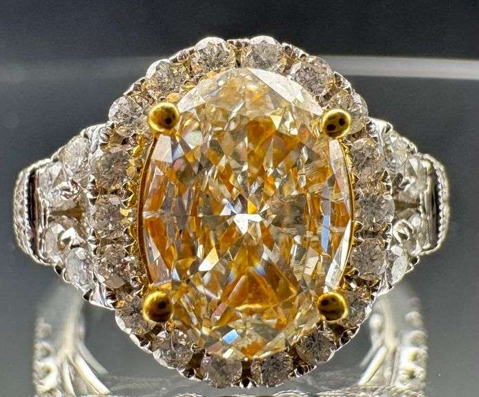 This beautiful 14K two-tone gold ring features 2.51 TW carats of stunning oval cut diamond weighing at its center of 1.66 ct, set in four prong setting and round brilliant cut diamonds on the side of 0.85 ct, set in prong setting. The center diamond boast an impressive light fancy yellow color and VS2/SI1 clarity; the side stones have F-G color and VS2/SI1clarity. All the diamonds are earth-mined. This elegant ring weighs a total of 5.9 grams and is a size 6, which is resizable. Stamped 14K.