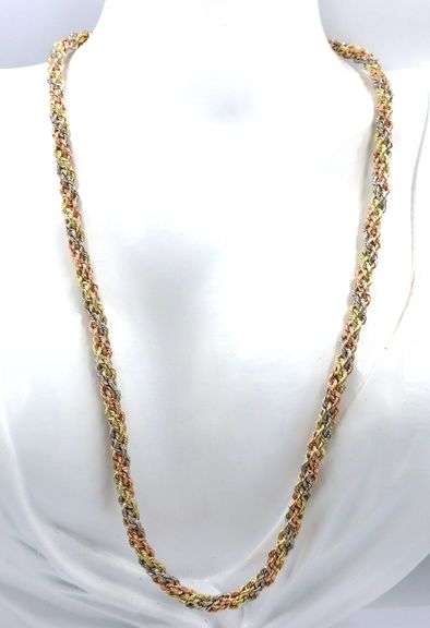 14kt Tri color gold rope 18.5-inch chain necklace with lobster clasp. The total weight of the necklace is 10.40 grams.