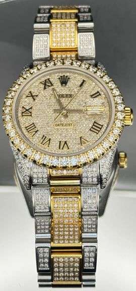 Rolex watch featuring 36mm dial in stainless steel and gold combination. Full diamond dial with custom diamond Jubilee band, fold-over clasp. Total approximate diamond weight 11.5ct, natural earth-mined diamonds, G-H color, SI1 clarity. Original Rolex automatic movement retained. Includes complete original box. Guaranteed authentic. Comes with appraisal. Please review all photos carefully before bidding.