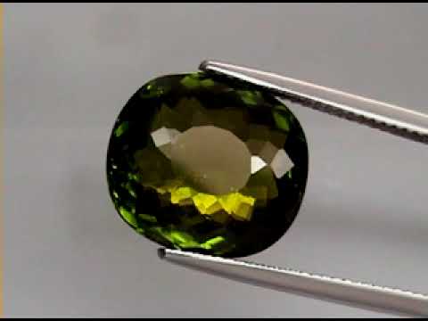Talk about rich color! The center of this piece displays a rich olivine hue tempered with a slight yellow undertone, and it is surrounded by gorgeous forest green. You can see the color difference in the picture. Measuring an impressive 14.7mm x 13mm x 7.2mm, its modified oval cut has a thinner profile giving it a larger surface area without sacrificing strength, and every tightly cut facet glistens under its superior luster. This is an untreated example of pure Mozambique tourmaline.