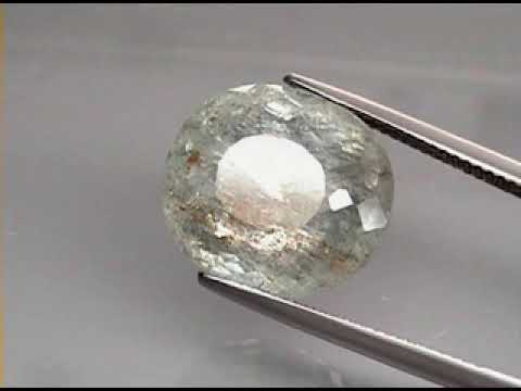 The internal characteristics of this piece are simply stunning. It has small feathers and tracks of bubbles interspersed with black specs and a splash of gorgeous copper color. The color palette of this gem is a stealy blue green with very light saturation, and its cosmic display is held under a glistening superior luster. This aquamarine is not only unique, but also weighs a whopping 14.88 carats, and measures 16mm x 14.3mm x 9.5mm.