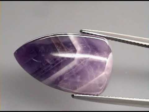This is a gorgeous piece! The natural formation of white quartz and amethyst results in angular patterns, creating these beautiful and unique gems. They are like the fingerprints of the gem world, as no two are identical. This example has a smooth drop cabochon cut, or bullet cut, with a high polished luster. It measures 22.2mm x 13.4mm, and is untreated. Sourced from Bolivia. Chevron amethyst is said to promote relaxation and self descovery.
