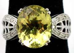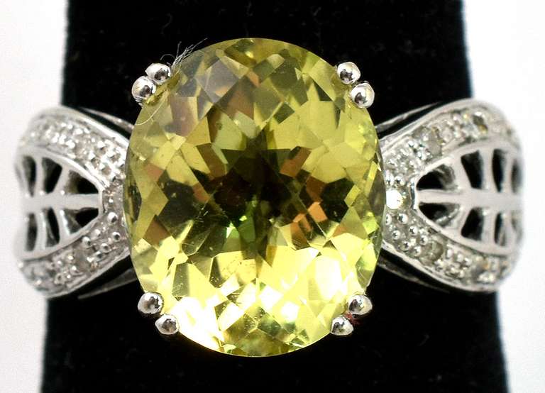 Refreshing approx. 5.70CT Peridot Ring with Diamond Accents in 14KT White Gold. Leaf-Motif cutout shoulders. Size 7. Total weight is 4.7g.