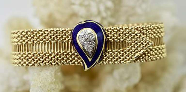 Elegant 14k yellow gold vintage bracelet with an adjustable blue enamel and diamond clasp. The bracelet weighs 35.8 grams.