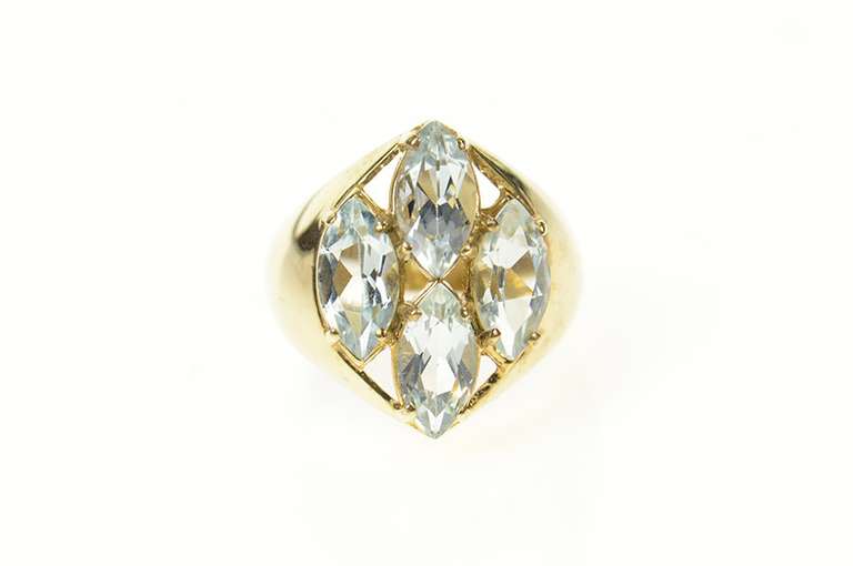 You are bidding on a 10K Yellow Gold Marquise Blue Topaz Squared Cluster Ring. This item has a composition of 10k Gold Marked. This is beautifully accented with 4x=Blue Topaz. The item's condition is Estate:Good. This item has a weight of 5.4 grams. We would consider this piece to be Vintage. This ring is size 6.75.
