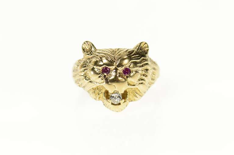You are bidding on a 10K Yellow Gold Roaring Lion Ruby Diamond Tiger Statement Ring. This item has a composition of 10k Gold Marked. The center gemstone is 1x=Diamond. This is beautifully accented with 2x=Ruby. The item's condition is Estate:Good. This item has a weight of 7.6 grams. We would consider this piece to be Vintage. This ring is size 5.