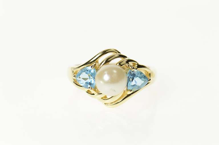 You are bidding on a 14K Yellow Gold Pearl Blue Topaz Accent Statement Wavy Ring. This item has a composition of 14k Gold Marked. The center gemstone is 1x=Pearl. This is beautifully accented with 2x=Blue Topaz. The item's condition is Estate:Good. This item has a weight of 4.7 grams. We would consider this piece to be Vintage. This ring is size 6.75.