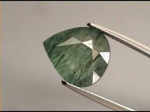 This rare emerald displays a deep forest green hue with a silver sheen and strong rutilation that can be seen through smoky clarity. It has a superior luster that shimmers across its facets, and measures 12.3mm x 11mm x 6.5mm. Sourced from Columbia. Oiled only.