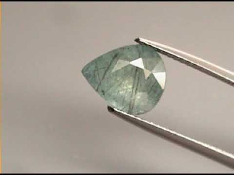 This rare emerald displays a rich green hue with a silver sheen and strong rutilation that can be seen through smoky clarity. It has a superior luster that shimmers across its facets, and measures 10.5mm x 8.5mm x 6.1mm. Sourced from Colombia. Oiled only.
