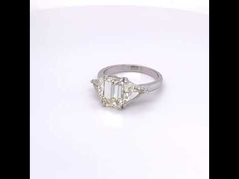 Extravagant 18kt white gold ring showcasing one central emerald cut diamond and two twillion cut diamond shoulders. The main emerald cut diamond is approximately 2.01cts, clarity VS-1, color K, while the two trillion cut diamonds are 2.01ctw, Clarity VS-1 to VS-2, color J-K. Stamped 18kt. Total weight of ring: 4.73 grams. Size 6.