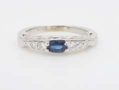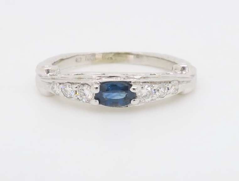 Unique carved 14k white gold ring with a center Oval Blue Sapphire and diamonds.