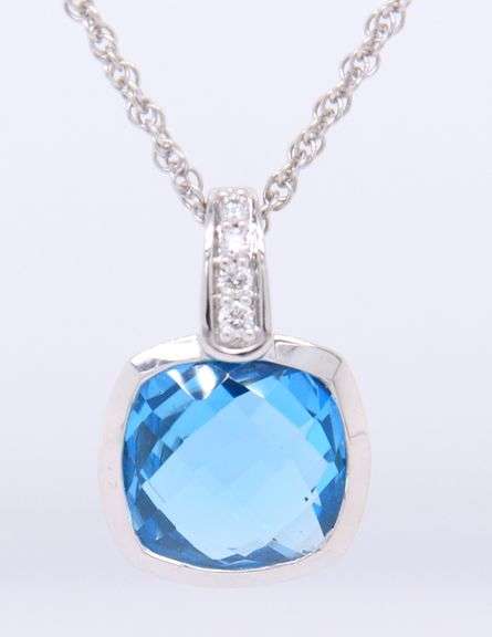 Charming 14kt White Gold Blue Topaz and Diamond Pendant on 18 inches Rope Chain Necklace. Total weight of Necklace 4.70 Grams.