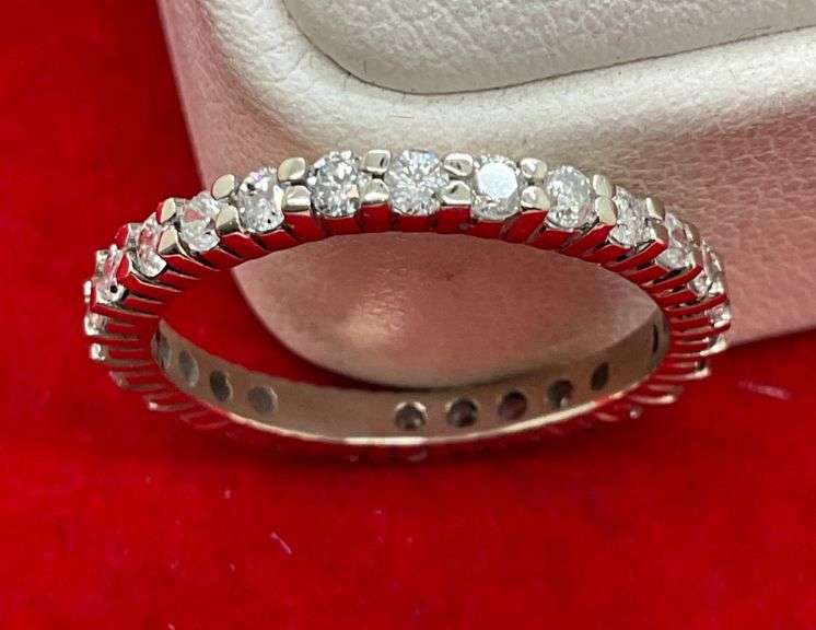 CERTIFIED 14K WHITE GOLD AND DIAMOND ETERNITY RING. IT HAS A TOTAL OF 1.00 CARAT OFF ALL NATURAL ROUND BRILLIANT CUT DIAMONDS SET IN SMALL PRONGS ALL AROUND. DIAMONDS ARE F-G IN COLOR AND SI1-I1 IN CLARITY. RING IS SIZE 6.5. GOLD WEIGHT IS 2.07 GRAMS. RING IS 2.2MM WIDE. DIAMONDS ARE 100% NATURAL EARTH MINED , IN OVERALL VERY GOOD CONDITION. WAS JUST INSPECTED AND POLISHED BY A JEWELER. CERTIFIED BY C.G.L, CERTIFICATE #2033563534092018. CAN BE VERIFIED AT CGL-LABS.COM