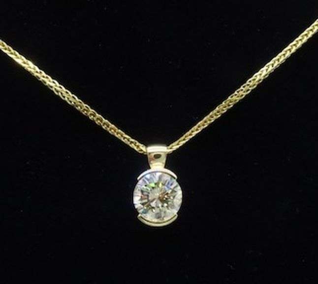 Stunning half bezel set diamond solitaire pendant necklace in 14k yellow gold. Diamond Carat Weight: 1.64CTW Diamond Cut: Round Brilliant Color: M Clarity: VS2 Metal: 14K Yellow Gold Pendant Length: .5" with bail Necklace Length: 20” Long Marked/Tested: Stamped “14K"  Weight: 5.09 Grams