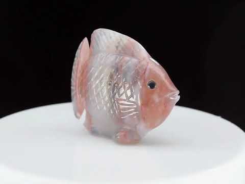 This charming piece is carved out of white, gray, and reddish orange agate that flows between opaque and translucent giving it the illusion of life and movement. Its sapphire cabochon eyes twinkle with a glossy liquid luster, and it measures an impressive 29mm x 24.5mm x 9.1mm. Sourced from Africa, untreated.