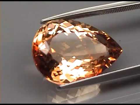 This is a great piece. It has a champagne based hue with a slight golden undertone that glitters in a mix of liquid and confetti flashing. The pear cut is perfect for accenting its deep whiskey red tip which makes it resemble the burnt tip of a match stick. Its size is perfect for displaying, measuring 16.5mm x 12mm x 7.6mm, and it shines with a shimmering luster. Sourced form Brazil.