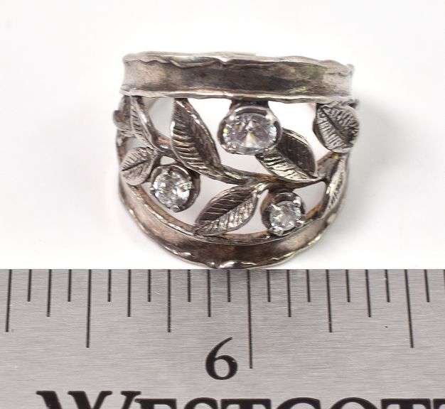 CZ Leaf Wide Band Ring in Sterling Silver. This adorable silver ring displays a wide band with an open silver leaf work design mounted with three round cut CZ gemstones in a prong setting. The size of this ring is 7. Total weight is 4.9 grams.