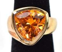 Citrine Gemstone Ring in Sterling Silver. This adorable silver gold plated ring displays a trillion cut citrine gemstone in a bezel setting supported by a bypass band design. The size of this ring is 5. Total weight is 8.9 grams.