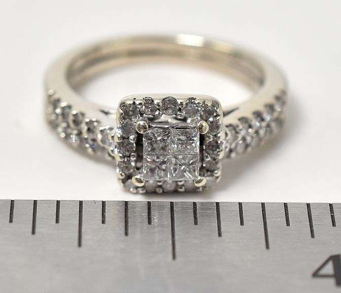 Fantastic Diamond Engagement Ring in 14K White Gold. A beautiful 14k gold ring features amazing princess cut diamonds center stones within a round cut diamond bezel and accenting round cut diamonds on the shoulders. Total weight 3.9 grams. Size 3 3/4.