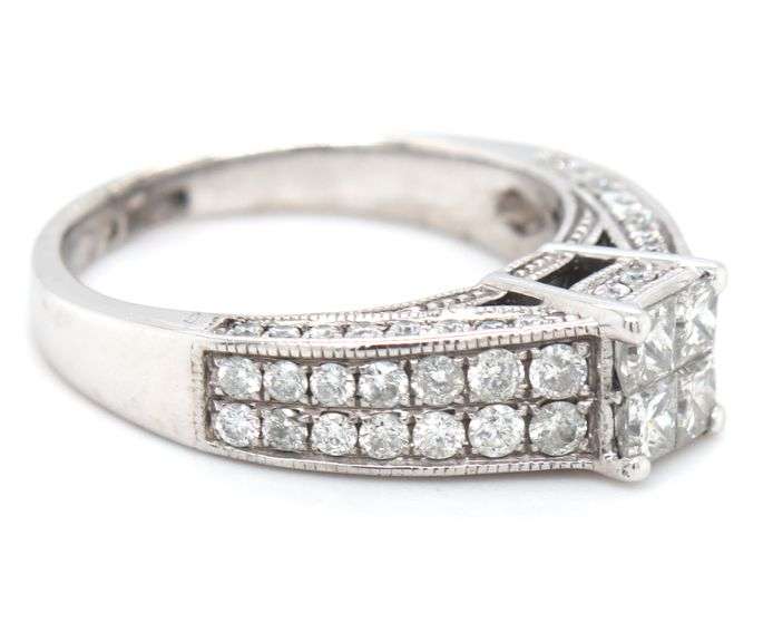 14kt White gold approximate 1ctw Invisible set diamond ring. Color G-H. Clarity VS. The total weight of the ring is 5.30 grams. Ring size 7".