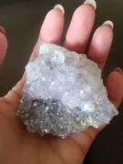 Angel Aura Amethyst Geode with a titanium bonded quartz crystal known for its vibrant energy and calming effect. Measuring approximately 1.5 to 2.5 inches across. It shows the natural hexagonal formation of quartz, which forms over millions of years as the final mineral to crystallize within rock cavities.