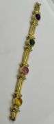 This beautiful 14K yellow gold antique bracelet features four distinct colored stones: amethyst, citrine, and green and pink tourmalines. Each stone is cut in a cabochon style and set in a bezel setting, highlighting their vibrant hues. Weighing 28.5 grams, this elegant piece is secured with a butterfly wing clasp and is stamped 14K, making it a timeless addition to any jewelry collection. |