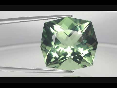You don't want to miss this piece! Its unique cut creates brilliant light return that mixes glittering wide stroke flashing with smooth flowing liquid flashing for a breath taking display that is easily seen from arms length. The color of this amethyst is a gorgeous aqua green tempered by a yellow undertone that is reflected in its flash palette. Measuring an impressive 22.3mm x 20.7mm x 14.3mm this large gemstone fills a standard gem jar, and every facet is covered with a shimmering superior luster. Sourced from Brazil. Untreated. ( Note: The video color is true to the actual hue. The camera lighting deepend the gems color palette. )