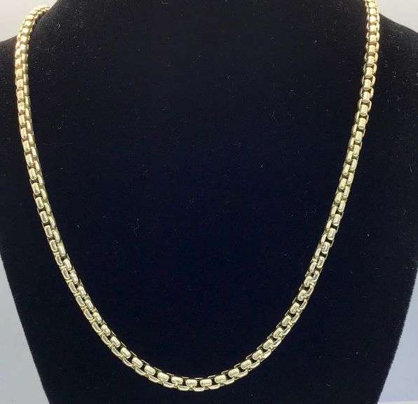 This stunning 14K yellow gold chain is 20 inches long and 2 mm wide, weighing 10.5 grams. The chain features a lobster safety clasp. Stamped 14K.