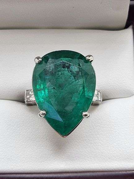 Investment! This unbelievably luxurious piece is investment quality - featuring an eyewatering 19.75 ct pear cut Zambian Emerald centerpiece, this 18kwg ring comes in at a whopping 18.9g and comes with certification. Size 6
