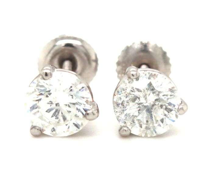 One pair of 14kt white gold approximate 1.60ctw round brilliant cut diamond stud earrings. Color I-J. Clarity I2-I3. The total weight of the earrings is 1.70 grams.