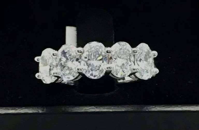 This exquisite 14K white gold ring is adorned with a total of 3.60 carats across five beautiful lab-grown oval-cut diamonds. Each stone is perfectly showcased in a classic four-prong setting, highlighting its impressive E color and VS1 clarity. Weighing 4.8 grams, this ring is a size 9.5, easily resizable. Stamped 14K.