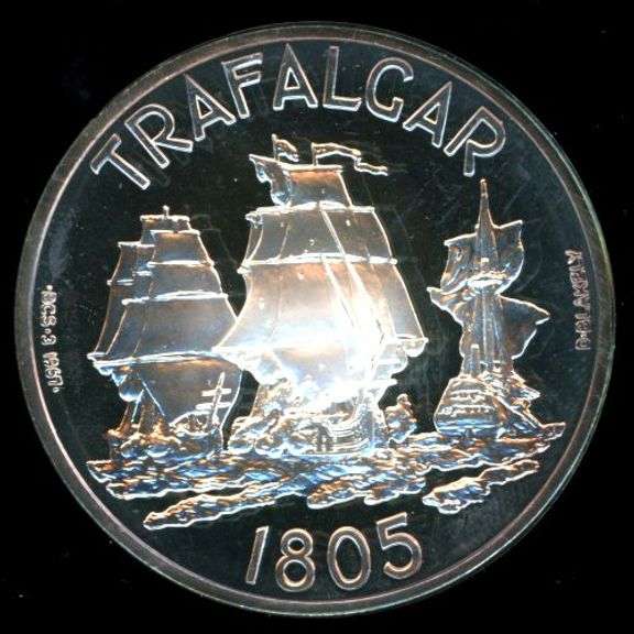 Gorgeous deep prooflike surfaces on this gorgeous large silver medal commemorating the 1805 Battle of Trafalgar and Admiral Nelson. Consists of 1.32 Troy Ounces of .999 Fine Silver.